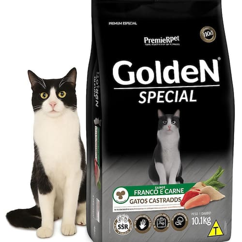 Ração Golden Gatos Castrados Premium 10,1kg Frango Carne Ração Golden Special Gatos Castrados Sabor Frango e Carne 10,1kg A Ração Golden Special Gatos Castrados é desenvolvida especialmente para atender as necessidades nutricionais de gatos adultos castrados. Sua fórmula completa e balanceada oferece o equilíbrio ideal entre sabor e saúde, garantindo uma alimentação de qualidade premium para o seu pet. Com proteínas de alta qualidade, como frango e carne, esse alimento auxilia na manutenção da massa muscular, promove energia e contribui para a saúde geral do gato. Além disso, contém ingredientes selecionados que ajudam no controle do peso, fundamental para gatos castrados, que tendem a ter metabolismo mais lento.