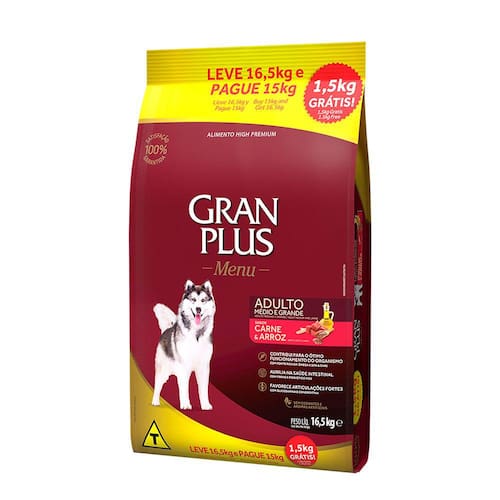 Ração Gran Plus Cães Menu Adultos Médias/Grande Carne e Arroz Bônus Bag - 16,5Kg- Indicada para cães adultos; - Ossos e dentes saudáveis; - Articulações fortes; - Alta qualidade.