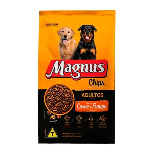 A magnus premium chips é um alimento para cães adultos, com ingredientes selecionados com vitaminas e proteínas, fornecendo benefícios necessários para o seu cão.