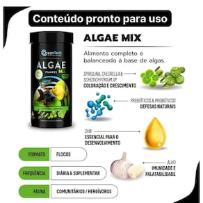 Oceantech Algae Mix é um alimento completo e balanceado, formulado para atender às necessidades nutricionais e promover mais cor para seus peixes.