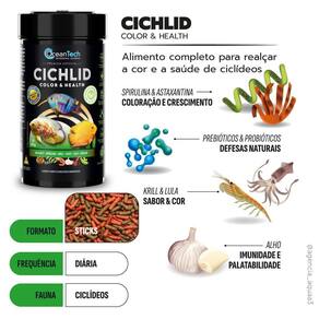 Ração Ocean Tech Cichlid Color e Health 75g Oceantech Cichlid Color e Health é um alimento balanceado, desenvolvido para ciclídeos onívoros de médio e grande porte, promovendo crescimento rápido e coloração vibrante. Formulado com proteínas animais e vegetais de alta qualidade, é ideal para peixes que necessitam de uma dieta rica em proteínas e carotenoides. A combinação de camarão, e krill fornece proteínas e ômega 3, essenciais para o desenvolvimento muscular e a saúde geral. A alga Ascophyllum Nodosum contribui para o fortalecimento do sistema imunológico, enquanto a espirulina oferece antioxidantes que estimulam a vitalidade. A ervilha auxilia na digestão e a alfafa adiciona fibras e nutrientes. O alho fortalece as defesas naturais, e a astaxantina intensifica a coloração dos peixes. Além disso, os compostos naturais cinamaldeído, carvacrol e fornecem propriedades antimicrobianas, enquanto a zeólita melhora a qualidade da água, mantendo o aquário limpo e saudável. Com Oceantech Cichlid Color e Health, seus peixes terão crescimento saudável e cores intensas. Indicação de uso: Alimento completo, na forma de bastões, para ciclídeos. Modo de usar: Oferecer duas a três vezes ao dia, em quantidade suficiente para ser totalmente consumida em poucos minutos, sem deixar sobras.