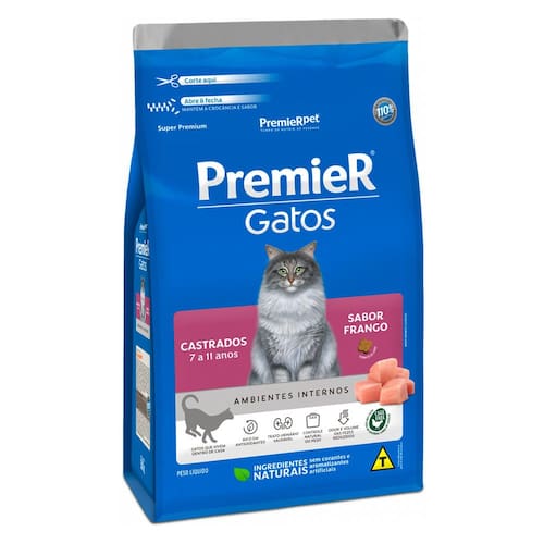 PremieR Gatos Castrados 7 a 11 anos Frango é um alimento Super Premium que faz parte da linha PremieR Gatos Castrados, uma linha de alimentos especialmente desenvolvida para garantir o máximo em saúde e vitalidade aos gatos através de cuidados nutricionais específicos pós castração.