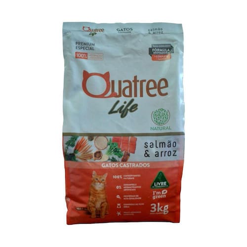 Ração Quatree Life Gatos Castrados Salmão e Arroz 3Kg Quatree Life Gatos Castrados foi desenvolvido com o objetivo de proporcionar uma alimentação mais saudável para os gatos castrados, com baixa atividade física ou que vivem em ambientes internos. É um alimento Premium Especial livre de transgênicos e formulado com conservantes 100% naturais para promover uma nutrição equilibrada. Contém fibras especiais que auxiliam na redução da formação de bolas de pelos, e prebiótico MOS , que otimiza a absorção dos nutrientes, melhorando a consistência e atenuando o odor das fezes. Possui fontes de proteínas selecionadas e nutrientes essenciais para atender as necessidades do seu gato. É enriquecido com L-carnitina, importante no metabolismo da gordura e no controle de ganho de peso. NÍVEIS DE GARANTIAProteína Bruta mín. 360g/kg 36,00%Extrato Etéreo mín. 100g/kg 10,00%Matéria Fibrosa máx. 40g/kg 4,00%Matéria Mineral máx. 75g/kg 7,50%Cálcio mín. 8.000mg/kg 0,80%Cálcio máx. 15.000mg/kg 1,50%Fósforo mín. 7.000mg/kg 0,70%Sódio mín. 2.000mg/kg 0,20%Potássio mín. 6.000mg/kg 0,60%Taurina mín. 1.500mg/kg 0,15%L-carnitina mín. 200mg/kg 0,02%Metionina mín. 10.000mg/kg 1,00%Lisina mín. 12.500mg/kg 1,25%Magnésio máx. 1.000mg/kg 0,10%Ômega 6 mín. 20.000mg/kg 2,00%Ômega 3 mín. 1.800mg/kg 0,18%Mananoligossacarídeo mín. 1.000mg/kg 0,10%Extrato de Alecrim mín. 10mg/kg 0,001%Tocoferol mín. 900mg/kg 0,09%PH Urinário mín. 6,2 - 6,8Umidade máx. 90g/kg 9,00%