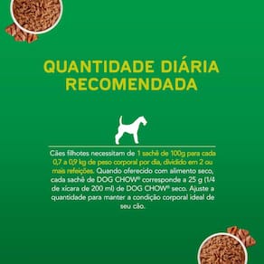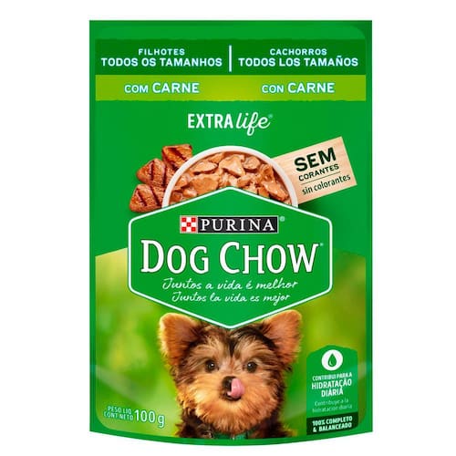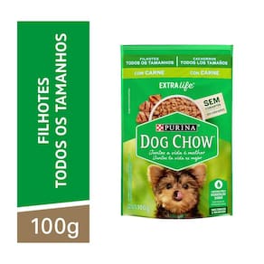 Ração para Cães Dog Chow Filhotes de Todos os Tamanhos Carne 100g PURINA® DOG CHOW® para cães filhotes de todos os tamanhos é um alimento 100% completo e balanceado. Por conter ingredientes de alta qualidade, além de nutrientes que oferecem uma nutrição plena e saudável para dar mais vitalidade ao seu cãozinho, o alimento pode ser dado de forma individual, sem a necessidade de complementação com a ração seca. Com sabor carne, o sachê vem com um molho encorpado e suculento, que agrada até mesmo os paladares mais exigentes. Além de cuidar da saúde com o seu pet, o alimento úmido é um ótimo agrado para ser incorporado na alimentação diária do seu cãozinho. Essa nova fórmula contém prebiótico natural, que equilibra a flora intestinal, sem afetar os hábitos do seu cão. PURINA® DOG CHOW® apresenta agora em todos os produtos ExtraLife®, um mix de antioxidantes, vitaminas e minerais, que ajuda a maximizar a qualidade de vida do seu cão dia após dia. Isso porque nós sabemos que o seu pet é um membro especial da sua família e, por essa razão, nós nos importamos com a sua saúde, cuidado e bem-estar. Quando você traz um cão para sua família, sua vida muda. Você se compromete com novas responsabilidades, respeitando e cuidando de todas as necessidades do seu cão. Ele, por sua natureza incondicional, enche sua vida de mais vida; mais companhia, cumplicidade e momentos especiais, contribuindo para o bem-estar de toda sua família.