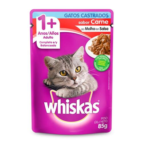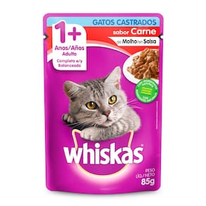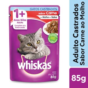 Ração Úmida para Gatos Whiskas Adultos 1+ Anos Castrados Sabor Carne em Sachê 85g Com um molho ainda mais encorpado, sem conservantes, sem corantes artificiais e sem aromatizantes artificiais, para deixar um sabor irresistível e saudável. Embalagem, prática, fácil de abrir e que contém a medida certa para uma refeição saudável, completa e balanceada. Whiskas sabe o que os gatos naturalmente precisam e amam. Por isso, cada sachê é preparado cuidadosamente com ingredientes de alta qualidade, garantindo os nutrientes que eles precisam todos os dias. Vantagens: Variedade de Sabores Composição de acordo com a idade Opção para gatos castrados
