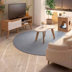 Características adicionais: Rack - Para para TV até 60 polegadas; Porta basculante; Pés em MDF 25mm; Detalhes em baixo relevo; pintura UV com acabamento fosco | Mesa de Centro - Produto em MDF; Formato curvo, leve e atual; Tampo e pés de MDF 25mm; Bordas boleadas | Mesa de Apoio - Pode ser usada como mesa de apoio e/ou casinha para pets; O tampo pode ser montado para esquerda ou direita; Espaço para armazenamento embaixo do tampo; Recorte em forma de coração.