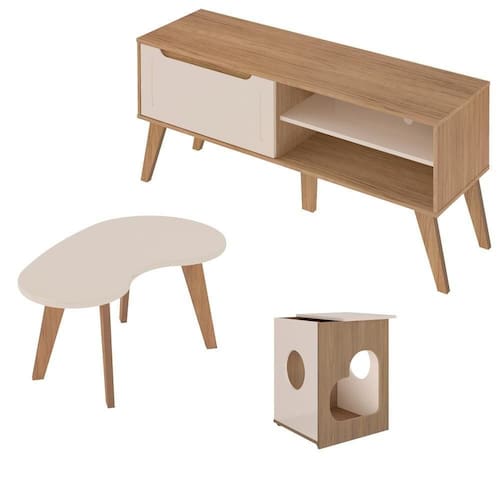 Características adicionais: Rack - Para para até 60 polegadas; Porta basculante; Pés em MDF 25mm; Detalhes em baixo relevo; pintura UV com acabamento fosco | Mesa de Centro - Produto em MDF; Formato curvo, leve e atual; Tampo e pés de MDF 25mm; Bordas boleadas | Mesa de Apoio - Pode ser usada como mesa de apoio e/ou casinha para pets; O tampo pode ser montado para esquerda ou direita; Espaço para armazenamento embaixo do tampo; Recorte em forma de coração.