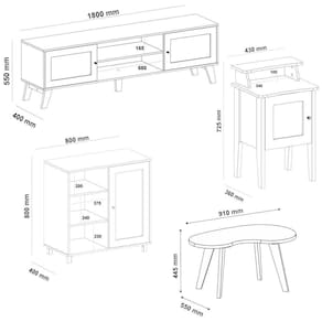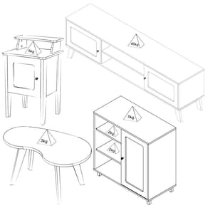 Peso suportado: Rack - Tampo 45Kg | Buffet - Tampo 5kg / Prateleiras 2kg cada | Mesa de Centro - Tampo 3kg | Mesa de Apoio - Tampo 5Kg
