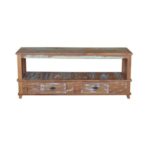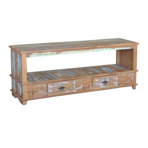 Rack aparador Lorena de 150 cm em madeira maciça com acabamento pátina, 2 gavetas e prateleiras para organização. Ideal para decorar e otimizar espaços com elegância e durabilidade. Produto robusto e funcional, perfeito para salas, corredores e ambientes variados.