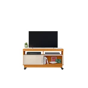 O Rack Artur é uma opção prática e funcional para compor a sala, oferecendo organização para eletrônicos, objetos decorativos e itens do dia a dia. Seu design conta com rodízios, facilitando a movimentação e a limpeza do ambiente.