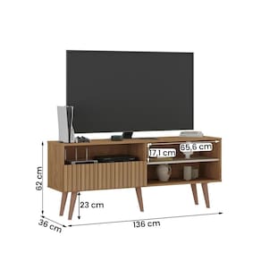 Modelo: Rack Atacama; Material da estrutura: MDP de 15 mm; Dimensões: 150 cm(L) x 62cm(A) x 36 cm(P); Tamanho máximo de TV: até 65” Polegadas; Quantidade de portas: 01 basculante (dobradiças metálicas com articulador); Com puxador: Não se aplica; Quantidade de nicho: 03; Peso suportado: até 30 kg distribuídos; Requer montagem: Sim (kit montagem incluso);