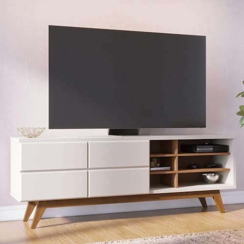Com um visual urbano e moderno, a bancada Noronha é um rack multifuncional, ideal para compor sua sala de estar. Com medidas amplas possui um tampo que permite acomodar uma de até 70 ou servir de apoio para livros, adornos, aparelhos eletrônicos e demais objetos decorativos. Possui portas com fecho toque e detalhes chanfrados com pintura , nichos internos, adega com porta-garrafas para até 6 unidades e pés em madeira maciça. Ideal para renovar seu ambiente com bom gosto e sofisticação.