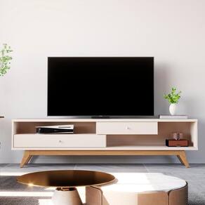 Possui duas gavetas espaçosas com corrediças telescópicas, prateleira para eletrônicos e amplo espaço para decoração.