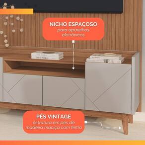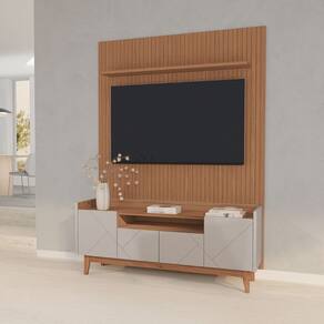 O conjunto Painel Sena e Rack Bancada Arena oferece uma combinação de requinte, modernidade e funcionalidade para a decoração. O Painel Sena destaca-se pelo design com acabamento frisado, que simula o visual da madeira ripada, adicionando textura e profundidade ao ambiente. Ele cria uma base elegante e clean para a TV e conta com uma prateleira superior integrada, ideal para exibir decorações ou livros, tornando-o uma peça central e versátil. O Rack Bancada Arena complementa o conjunto, sendo estruturado para acomodar TV's de até 60 polegadas. Ele possui portas frontais em MDF usinadas com um detalhe exclusivo de frisos e é sustentado por pés de madeira maciça com feltro para proteção do piso. A bancada oferece amplo espaço interno para organização, com nichos abertos e compartimentos fechados.