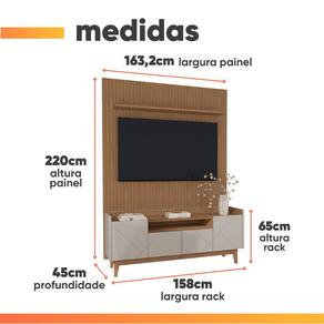 MEDIDAS BANCADA: A = 65 cm L = 158 cm P = 45 cm MEDIDA PÉS BANCADA: A = 17 cm MEDIDAS PAINEL: A = 220 cm L = 163,2 cm P = 2 cm MEDIDAS PRATELEIRA PAINEL: L = 135 cm P = 15 cm PRATELEIRA SUPORTA ATÉ: 5 kg NICHO SUPORTA ATÉ: 5 kg PESO BANCADA: 38 kg BANCADA SUPORTA ATÉ: 25 kg PESO PAINEL: 33 kg PAINEL SUPORTA ATÉ: 25 kg IDEAIS PARA TV DE ATÉ: 60 Polegadas MODELO: Rack Bancada Arena com Painel Sena para TV Até 60 Polegadas 4 Portas com Detalhe Frisado MARCA: Casa D PINTURA: UV de alta qualidade MATERIAL: MDF PRATELEIRAS: 1 NICHO: 1 PORTAS: 4 TIPO DE PORTA: Bater PÉS BANCADA: 4 MATERIAL DOS PÉS: Madeira Maciça ESPAÇO PARA PASSAR FIOS: Sim DIFERENCIAIS: Rack e Painel feito em MDF de alta qualidade, e detalhes frisados nas laterais INSTRUÇÕES E CUIDADOS: Recomenda-se limpar o produto com flanela ou pano macio seco, não utilizar produtos abrasivos, desengordurantes, álcool ou solvente. Mantê-lo em lugar livre de umidade e/ou exposição direta ao sol. ITENS INCLUSOS: 1 Rack Bancada, 1 Painel,1 Manual de montagem, 1 kit parafusos GARANTIA: 3 meses pelo fabricante.