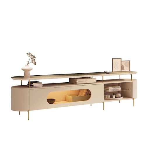 Marca: HB Móveis | Altura: 57,5 cm | Largura: 219 cm | Comprimento: 40 cm | Altura Embalado: 10,3 | Largura Embalado: 40,3 | Comprimento Embalado: 220,5 | Peso: 45,68 kg | Peso Embalado: 45,68 | Estado de origem: SP | Modelo: Rack Bancada Aria | Descrição do tamanho: 57,5 x 219 x 40 cm | Material: MDF de 15 mm, MDF de 18 mm e pés de aço | Garantia em meses: 03 meses de garantia para defeitos de fabricação | Tonalidade: Multicolorido | É kit: Não | Quantidade de gavetas: 0 | Quantidade de portas: 2 | Material dos pés: Aço | Material das alças: N/A | Com rodas: Não | Tamanho máximo de TV: 85 | Formato do móvel: Rack | Material das gavetas: N/A | Quantidade de prateleiras: 1 | Condição do item: Novo | Estilo: Moderno | Com portas: Sim | Profundidade: 40 cm | Com compartimento para alto-falantes: Não | Inclui manual de montagem: Sim | Requer montagem: Sim | Material das portas: MDF | Inclui passa-cabos: Não | Fonte do produto: Brasil | Código ANVISA (32481): Não se aplica | Código da Homologação ANATEL (32495): Não se aplica | Código INMETRO (32486): Não se aplica | Código MAPA (32485): Não se aplica | Quantidade de caixas de embalagem: 1 | batteries_required: Não | external_testing_certification: Não aplicável | included_components: Rack e manual de montagem | is_assembly_required: Sim | model_number: 28445 | number_of_items: 1 | part_number: 28445 | Principais caracteristicas 0: estrutura em MDF de 15 mm, MDF 18 mm e pés de aço | Principais caracteristicas 1: suporta TV até 85 polegadas | Principais caracteristicas 2: possui iluminação LED interno | Tamanho: Único Cor: Off White/Champanhe