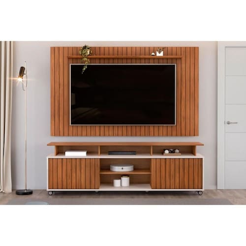 RACK BANCADA P/ TV ATÉ 70 POLEGADAS OLIMPIC RIPADO C/ NICHOS E RODIZIOS 180X60CM FREIJÓ/OFF WHITE - DJ MÓVEIS