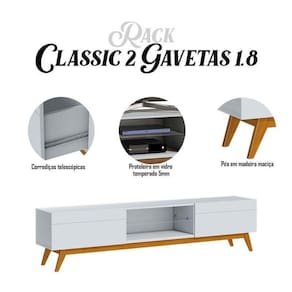 O rack da linha Classic combina funcionalidade e estilo para aprimorar qualquer ambiente. Projetado com uma prateleira em vidro, adiciona um toque de elegância e proporciona um espaço adicional para colocar seus aparelhos eletrônicos. Com duas gavetas equipadas com corrediças telescópicas, oferece amplo espaço interno para você manter seus itens organizados e de fácil acesso. As corrediças telescópicas garantem um movimento suave ao abrir e fechar as gavetas. Os pés em madeira maciça oferece mais estabilidade. Produzido pela Imcal, é desenvolvido em MDP/ MDF com materiais de alta qualidade garantindo mais durabilidade e resistência, prolongando sua vida útil. Será uma peça de destaque adiciona charme e estilo à sua sala de estar. Confira e garanta o seu!