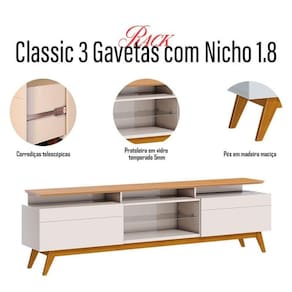 O rack da linha Classic 1.8 é um móvel elegante e funcional que combina design clássico com praticidade. Desenvolvido em MDP/ MDF, é fabricado pela Imcal com materiais de alta qualidade garantindo mais durabilidade e resistência. Apresentando uma prateleira em vidro, proporciona um toque refinado permitindo que você coloque seus itens ou aparelhos eletrônicos. Além disso, possui três nichos espaçosos, ideais para acomodar seus aparelhos eletrônicos. Com duas gavetas equipadas com corrediças telescópicas, oferece espaço adicional para guardar seus acessórios. As corrediças telescópicas garantem um deslizamento suave e silencioso, tornando o acesso mais prático. Os pés em madeira maciça oferece mais estabilidade. Com suas linhas clássicas e detalhes cuidadosamente trabalhados, é a escolha perfeita para quem busca estilo, praticidade e qualidade superior. Confira e garanta o seu!