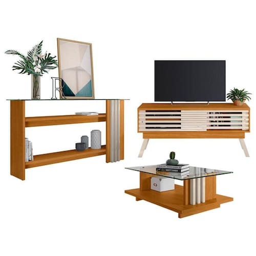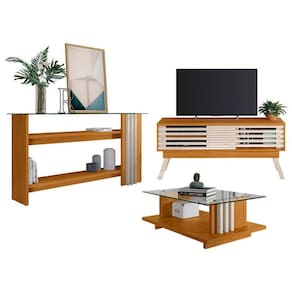 Este conjunto sofisticado combina harmoniosamente entre funcionalidade e elegância. O rack é equipado com duas portas sobrepostas e uma prateleira, oferecendo um ótimo espaço interno para guardar seus objetos. O aparador acompanha com tampo em vidro proporcionando um visual refinado, enquanto suas duas prateleiras oferecem espaço adicional para organizar e exibir seus itens favoritos. A mesa de centro completa perfeitamente o conjunto, seu tampo em vidro oferece uma superfície elegante para suportar itens. Contando com uma prateleira, permite que você mantenha seus acessórios sempre a mão. Fabricados pela Madetec, são desenvolvidos em 100% MDP com materiais de alta qualidade garantindo mais durabilidade e prolongando a vida útil dos móveis. O conjunto é a escolha ideal para quem busca um ambiente moderno, sem comprometer a praticidade. Confira e garanta o seu!