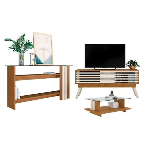 Este conjunto sofisticado combina harmoniosamente entre funcionalidade e elegância. O rack é equipado com duas portas sobrepostas e uma prateleira, oferecendo um ótimo espaço interno para guardar seus objetos. O aparador acompanha com tampo em vidro proporcionando um visual refinado, enquanto suas duas prateleiras oferecem espaço adicional para organizar e exibir seus itens favoritos. A mesa de centro completa perfeitamente o conjunto, seu tampo em vidro oferece uma superfície elegante para suportar itens. Contando com uma prateleira, permite que você mantenha seus acessórios sempre a mão. Fabricados pela Madetec, são desenvolvidos em 100% MDP com materiais de alta qualidade garantindo mais durabilidade e prolongando a vida útil dos móveis. O conjunto é a escolha ideal para quem busca um ambiente moderno, sem comprometer a praticidade. Confira e garanta o seu!