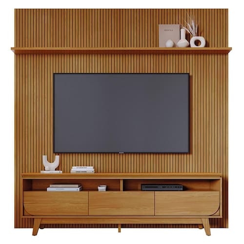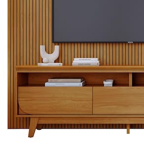 O Rack Bancada com Painel New Luna é a combinação do Painel New Guaporé e o Rack Bancada Selene, ideal para quem busca inovação na decoração da sala. O Painel Piso-Teto New Guaporé, em MDF e MDP com pintura UV, possui design frisado, prateleira superior e fixação na parede, garantindo um visual moderno e elegante, ideal para até 75. Já o Rack Bancada Selene se destaca pelo design refinado, com estrutura em MDP, 3 gavetas com corrediças telescópicas para organização eficiente e detalhe curvo nas gavetas laterais. Seu tampo suspenso de 25mm com borda chanfrada e pés usinados trazem um toque sofisticado. Ideal para quem busca estilo e praticidade.