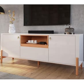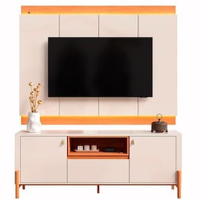 Com capacidade para TVs de até 75 polegadas, o conjunto oferece espaço bem planejado para acomodar aparelhos eletrônicos, acessórios e objetos decorativos, mantendo sua sala organizada e elegante.