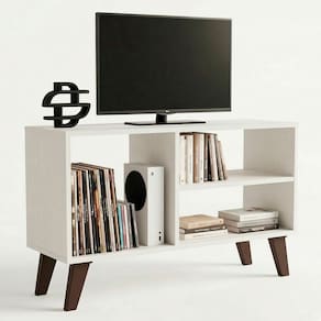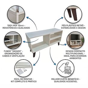 Seu design compacto e multifuncional permite acomodar TV de até 40 polegadas, além de organizar eletrônicos, livros e objetos decorativos com praticidade. O fundo vazado facilita a passagem de cabos e contribui para melhor ventilação dos aparelhos.