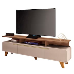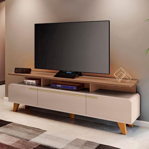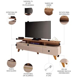 Seus cantos arredondados conferem um toque de suavidade e elegância, que é ideal para acomodar uma de até 70 polegadas sobre a sua base ampla e resistente, além disso abaixo do tampo conta com espaço para os eletrônicos. A Bancada Para Sala possui três portas basculantes com pistão a gás, que facilitam a abertura e o fechamento, além de garantir um espaço interno otimizado para guardar objetos e acessórios. Os puxadores metálicos em tom dourado contrastam com a cor neutra da bancada, criando um efeito visual de requinte e harmonia. Os pés de madeira maciça com acabamento envernizado proporcionam estabilidade e durabilidade ao Rack Para Sala, que é produzido em MDP e MDF de 25mm e 15mm, materiais de alta qualidade e ecologicamente corretos. Esta bancada é uma ótima opção para quem busca um móvel funcional, bonito e versátil para a sua Sala De Estar.