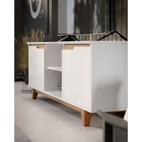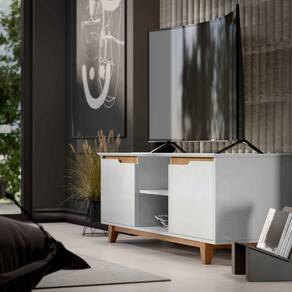 Rack Bancada Flow para Tv 146 cm 2 Portas com Pés de Madeira Branco com Freijó - Rede Móveis