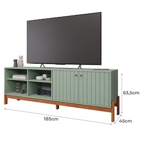 ESPECIFICAÇÕES: Estrutura em MDF Pintura UV 2 Portas Dobradiças slow motion Detalhe nas portas com efeito 3D ripado Puxadores na cor cobre Nichos Pés em MDF Ideal para TV até 60