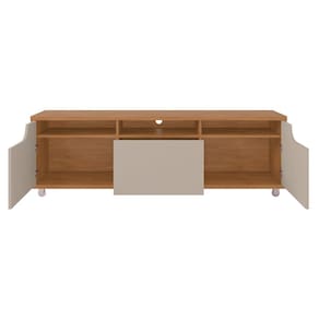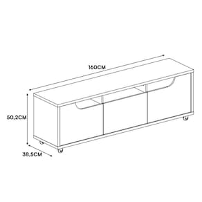 ESPECIFICAÇÕES: Estrutura em MDP Acabamento Print Wood 2 Portas laterais usinadas com detalhe curvo Dobradiças soft-close 1 Gaveta Corrediças telescópicas Nichos Tampo, base e laterais com 25mm de espessura Rodízios em silicone, sendo os frontais com trava Ideal para TV até 60