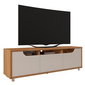 ESPECIFICAÇÕES: Estrutura em MDP Acabamento Print Wood 2 Portas laterais usinadas com detalhe curvo Dobradiças soft-close 1 Gaveta Corrediças telescópicas Nichos Tampo, base e laterais com 25mm de espessura Rodízios em silicone, sendo os frontais com trava Ideal para TV até 60