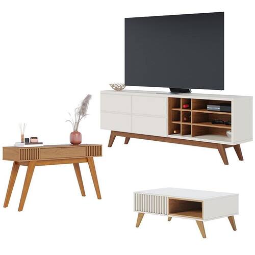 Rack Bancada Noronha 1.8 com Mesa de Centro Jeri Off White Matte Freijó e Aparador Riviera Freijó – Colibri