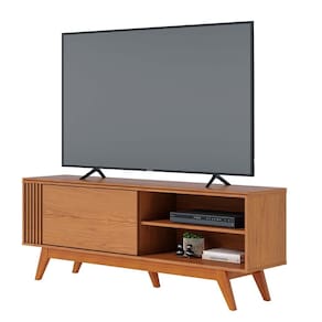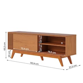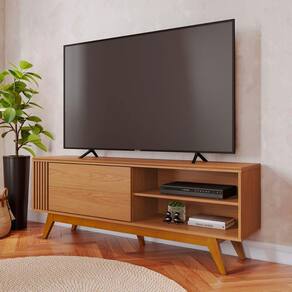 O tampo com detalhe chanfrado e o ripado artesanal frontal trazem um design único, enquanto a porta deslizante oferece praticidade.
