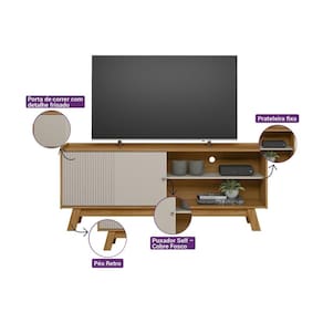 Tipo de Porta - Portas de Correr Quantidade de Portas - 1 Porta de Correr Tipo de Puxador - Puxador em ABS / PVC Quantidade de Prateleiras - 1 Prateleira Quantidade de nichos - 2 Nichos Ideal para TVs até (Polegadas) - 65 Quantidade de Pés - Móvel possui 5 pés