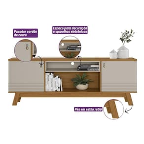 Tipo de Porta - Portas de Bater Quantidade de Portas - 2 Portas de Abrir Tipo de Puxador - Couro Quantidade de nichos - 2 Nichos Ideal para TVs até (Polegadas) - 75 Tipo dos Pés - Pés em MDF Quantidade de Pés - Móvel possui 6 pés