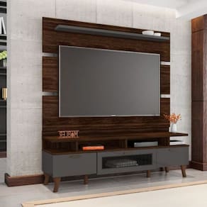 Suporte para TV de até 65 polegadas Porta central usinada revestida com tela sintética Estrutura em MDP/MDF (25 mm nas divisórias, tampo e prateleira) Painel com fixação segura por cunha Porta basculante com dobradiças de 35 mm e pistão a gás Puxadores em alumínio Espaço amplo para aparelhos e objetos decorativos Pés usinados em MDF