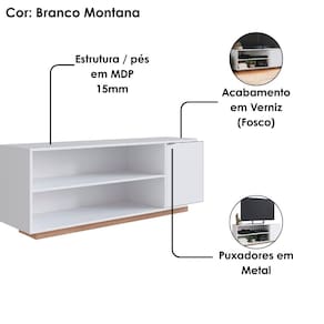 O Rack Bancada B56 combina elegância e funcionalidade, sendo a escolha ideal para complementar sua sala de estar! Estrutura em MDP de 15 mm (fundo 3 mm) com acabamento em verniz (fosco). Suporta até 25 kg (10kg no tampo e 5kg por nicho), comporta TVs de até 55 polegadas com segurança, composto por porta única com puxador e dobradiça metálica, sem pés apenas rodapé frontal (MDP 15 mm). ELETRÔNICOS OBJETOS DECORATIVOS NÃO INCLUSOS. Este produto será entregue em 1 volume.