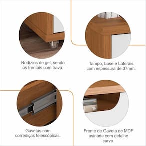 Estrutura: Tampo e laterais MDP de 25mm, base MDP de 37mm, portas e frente de gaveta MDP de 15mm