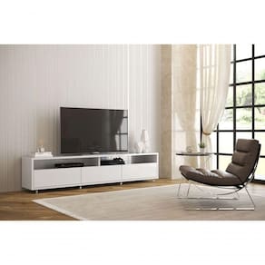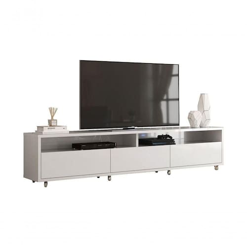Rack Bancada Para Tv Aspen Branco - Moveisaqui O Rack Bancada Aspen - MoveisAqui possui design moderno que conta com três gavetas e dois nichos que o tornam o móvel ideal para sua sala de estar. Seu amplo espaço acomoda diversos equipamentos eletrônicos, objetos pessoais e decorativos, seus rodízios facilitam a limpeza e deixam ainda mais ões do Produto Montado:Altura: 56 cm;Largura: 218 cm;Profundidade: 38,4 cm.Observações:- Fabricado em MDP;- Possui nichos;- 8 Rodízios;- Ideal para TVs de até 75;- Corrediças telescópicas;- Pintura ultravioleta com acabamento brilho. Marca: Não Informado