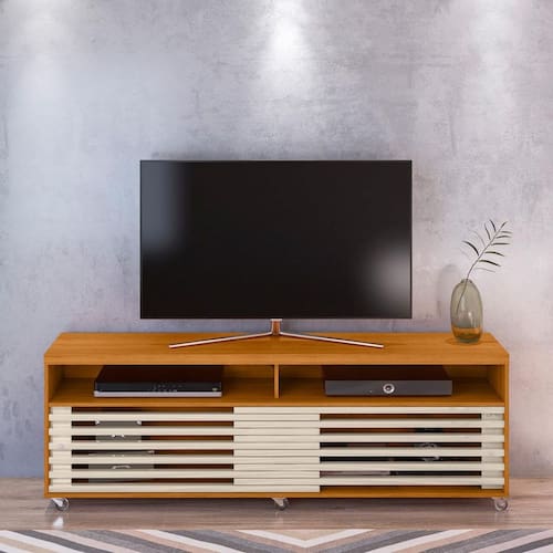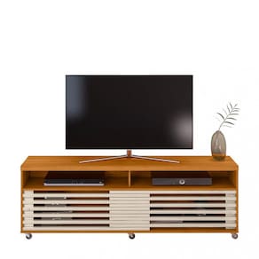 Características: 2 Portas deslizantes frisadas que se sobrepõem 6 Rodízios de silicone Estrutura em MDP Painéis em MDP de 15 e 25 e 40mm com pintura UV Peso total suportado 65 kg Puxadores em poliestireno cromado Sistema de fixação Girofix Suporte para TV de até 65 polegadas