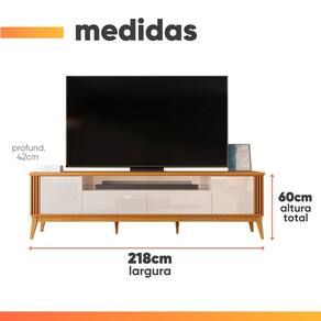 MEDIDAS: A = 60 cm L = 218 cm P = 42 cm MEDIDAS NICHO: A = 18 cm L = 121,4 cm MEDIDA PÉS: A = 20 cm NICHO SUPORTA ATÉ: 4 kg GAVETAS SUPORTAM ATÉ: 4 kg PRODUTO SUPORTA ATÉ: 30 kg PESO: 42 kg IDEAL PARA TV DE ATÉ: 75 Polegadas MODELO: Rack Bancada Para TV Até 75 Polegadas 2,18m 2 Portas Detalhe Ripado Vetro COR: Madeirado/Off White MARCA: EDN Móveis PINTURA: UV de alta qualidade ACABAMENTO: Semi brilho MATERIAL DA ESTRUTURA: MDP/MDF ESPESSURA DA ESTRATURA: 25 mm GAVETAS: 2 CORREDIÇAS: Telescópicas PORTAS: 2 TIPO DE PORTA: Bater DOBRADIÇAS: Pressão PUXADORES: Cava NICHOS: 1 PÉS: 6 MATERIAL DOS PÉS: Madeira Maciça DIFERENCIAIS: Design moderno e elegante / Pintura UV de alta qualidade / 2 Gavetas com corrediças telescópicas / Nicho para maior armazenamento / Pés em madeira maciça / Suporta TV de até 75". ITENS INCLUSOS: 1 rack, 1 manual de montagem, 1 kit parafusos INSTRUÇÕES E CUIDADOS: Para maior durabilidade, recomendável que a limpeza dos móveis seja feita com pano limpo e seco. Não usar produtos químicos ou abrasivos. GARANTIA: 3 meses pelo fabricante.