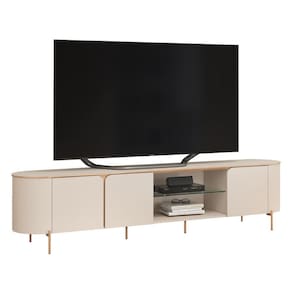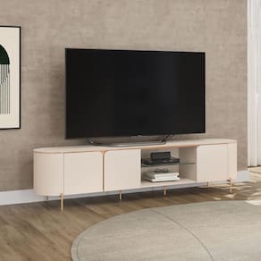 DIFERENCIAIS: Bancada com cantos arredondados / Tampo usinado com bordas em pintura na cor dourada / Pés metálicos cilíndricos na cor dourada / 3 portas com dobradiças com amortecimentos / Nicho com 1 prateleira central de vidro para itens de uso diário / Suporta TV de até 75.