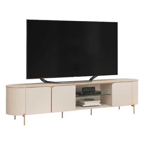 Leve elegância e funcionalidade para sua sala, com rack bancada Lívia. Seu tampo com bordas em pintura UV de alta qualidade na cor dourada garante um visual refinado, enquanto os cantos arredondados proporcionam segurança e um acabamento impecável. Os pés cilíndricos dourados completam o visual contemporâneo, adicionando um toque sofisticado. Com 3 portas que possui abertura suave e silenciosa, além de excelente espaço interno para organização. O nicho com a prateleira de vidro central é ideal para acomodar itens de uso diário com muita praticidade. Projetada para suportar TVs de até 75 polegadas, essa bancada une estética e funcionalidade, sendo a escolha perfeita para quem busca elegância com design moderno.