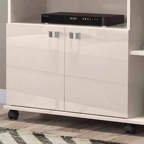 Características do Rack Bancada com Rodízios de Sala para Tv de até 40 Polegadas: - Estrutura em mdp; - 2 portas; - Rodízios; - Puxadores em ABS cromado; - Tampo em mdp 25mm; - Não acompanha objetos de decoração e aparelhos eletrônicos;