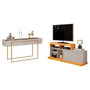 Está procurando móveis para montar sua sala? Apresentamos para você este belo conjunto composto pelo rack da linha Scala e o aparador da linha Suri. Seu design curvo traz suavidade ao visual, enquanto a porta deslizante com frisos decorativos dão um charme. Além disso, conta com cinco nichos para acomodar seus aparelhos e objetos, o puxador em MDF valoriza o acabamento e os rodízios ocultos facilitam a movimentação sem comprometer a estética. Compondo o conjunto, o aparador possui tampo com espelho aplicado, além das laterais chanfradas realçando o acabamento refinado. Os pés em metal na cor dourado agrega um toque de modernidade e luxo. Fabricados pela DJ Móveis são desenvolvidos em MDP/ MDF derivado de madeira de reflorestamento, sendo perfeito para quem busca unir design, funcionalidade e durabilidade, trazendo beleza e requinte para seu ambiente. Confira e aproveite!