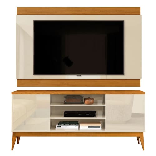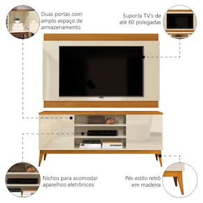 DIFERENCIAL: Prateleiras e nichos para acomodar aparelhos eletrônicos e objetos decorativos, pés estilo retrô em madeira, portas articuladas com puxadores no estilo cava, painel com acabamento semi fosco