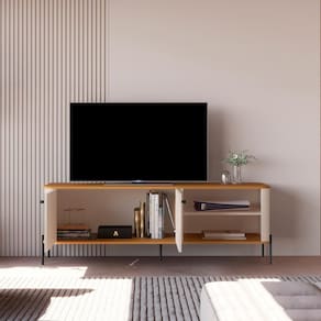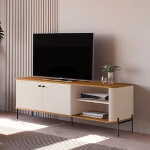 Produzido em MDF 15mm com pés em metal, suporta TVs de até 60 com segurança.