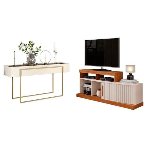 Começou a montar sua sala? Então apresentamos para você este belo conjunto composto pelo rack da linha Valle e o aparador da linha Petri. O rack apresenta um design curvo, enquanto sua porta deslizante com frisos decorativos dá um charme e praticidade. Com cinco nichos para melhor organização de seus aparelhos e objetos, puxador em MDF e rodízio oculto, sem perder a estética. O conjunto se completa com o aparador. Seu tampo com espelho aplicado, enquanto as laterais chanfradas e os pés em metal na cor dourado dão mais modernidade e requinte. Fabricados pela DJ Móveis, são desenvolvidos em MDP/ MDF derivado de madeira de reflorestamento. Com design moderno e materiais de alta qualidade, é a escolha perfeita para quem busca beleza e funcionalidade, valorizando sua sala de estar. Confira e aproveite!